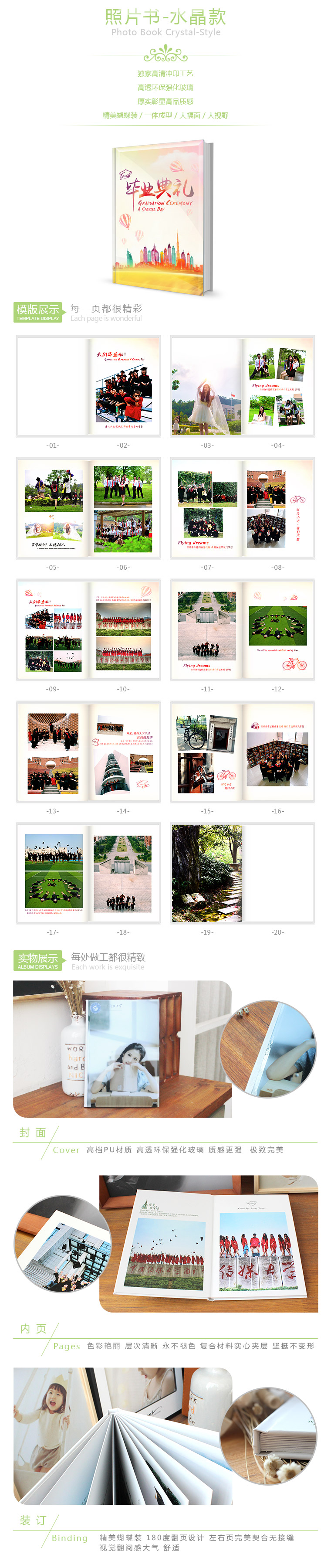 封皮高档进口PU;高透环保强化玻璃;内芯高档铜板纸和PVC夹层